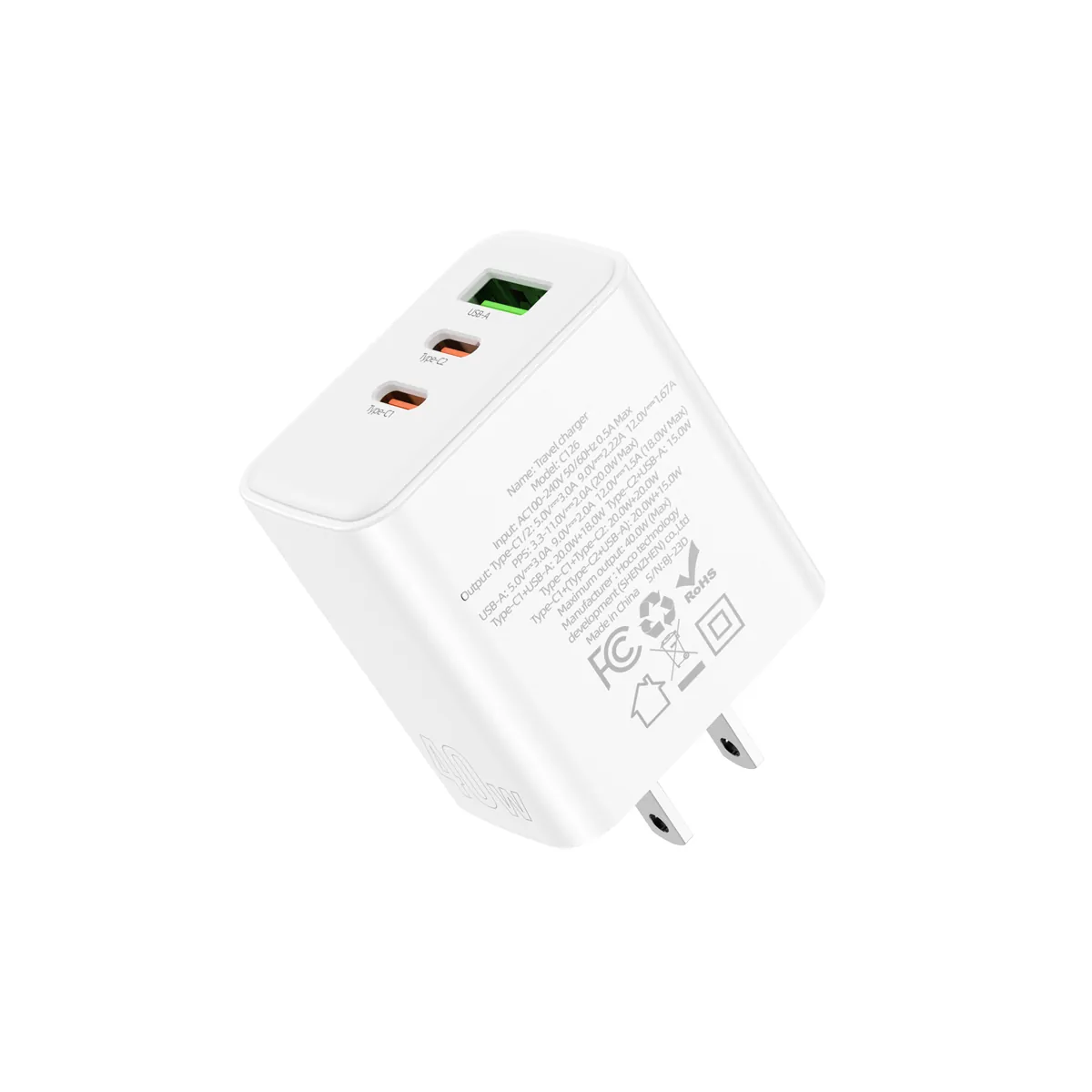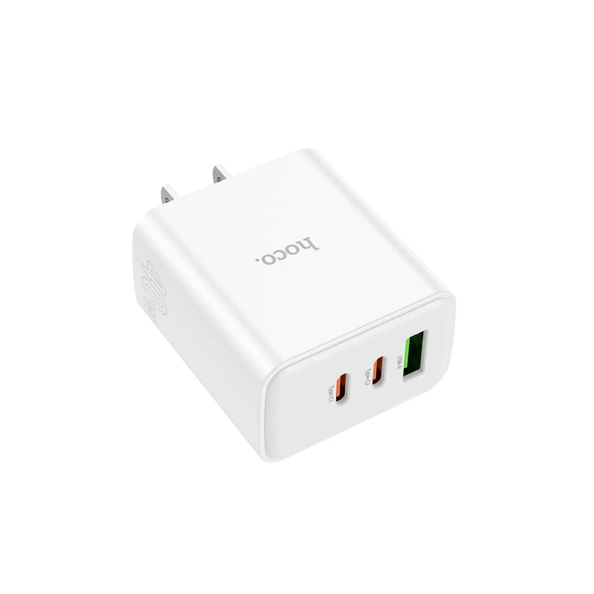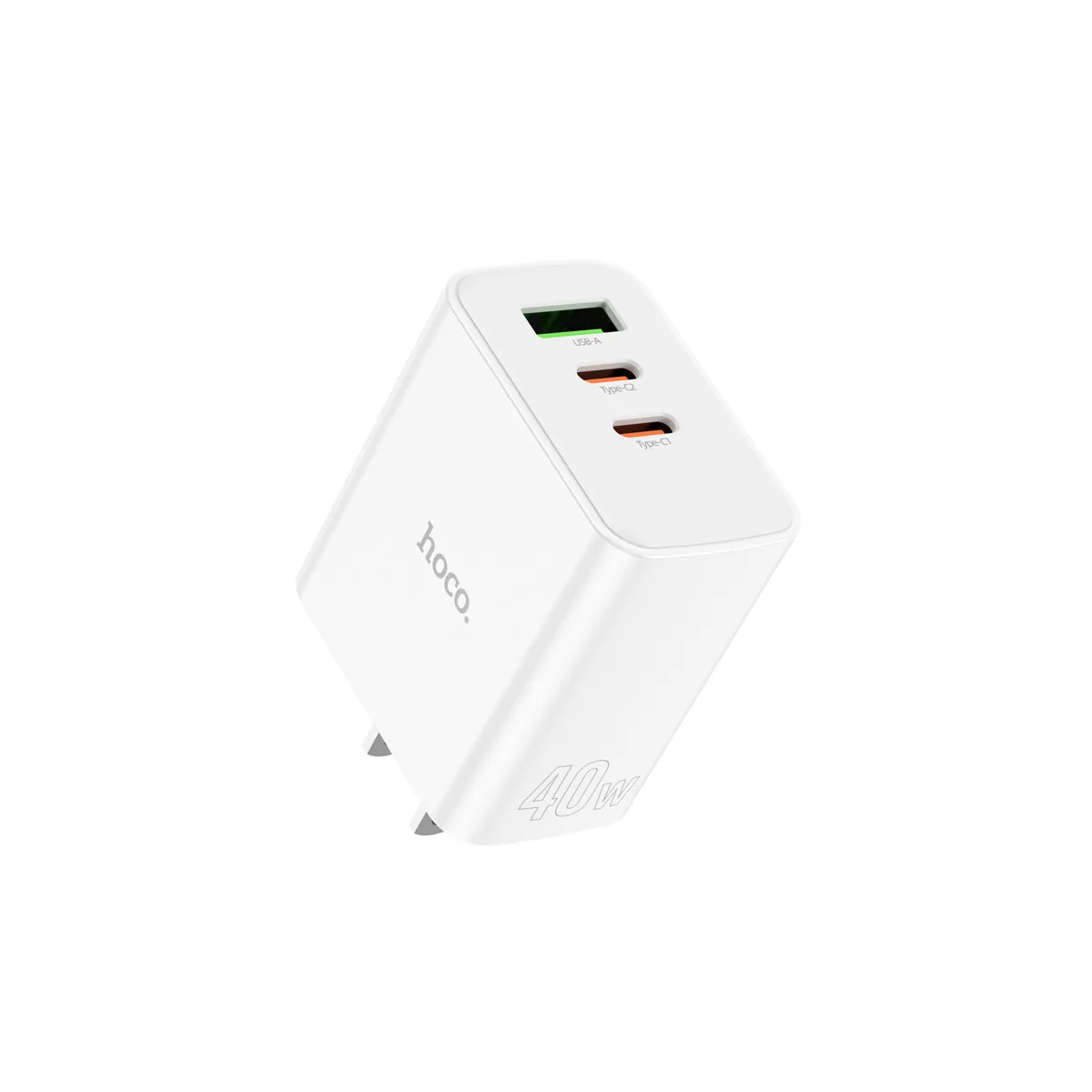 40W three-port wall charger with two 20W USB-C ports and one 18W USB-A. Charge your phone, tablet, and earbuds all at once — US plug, compact body.