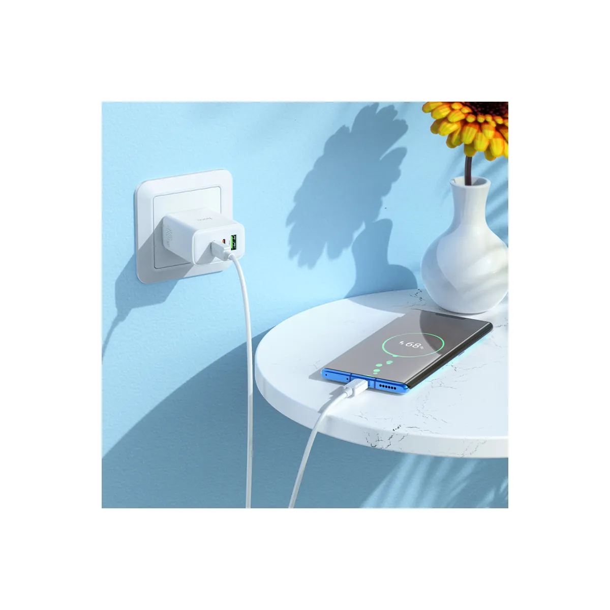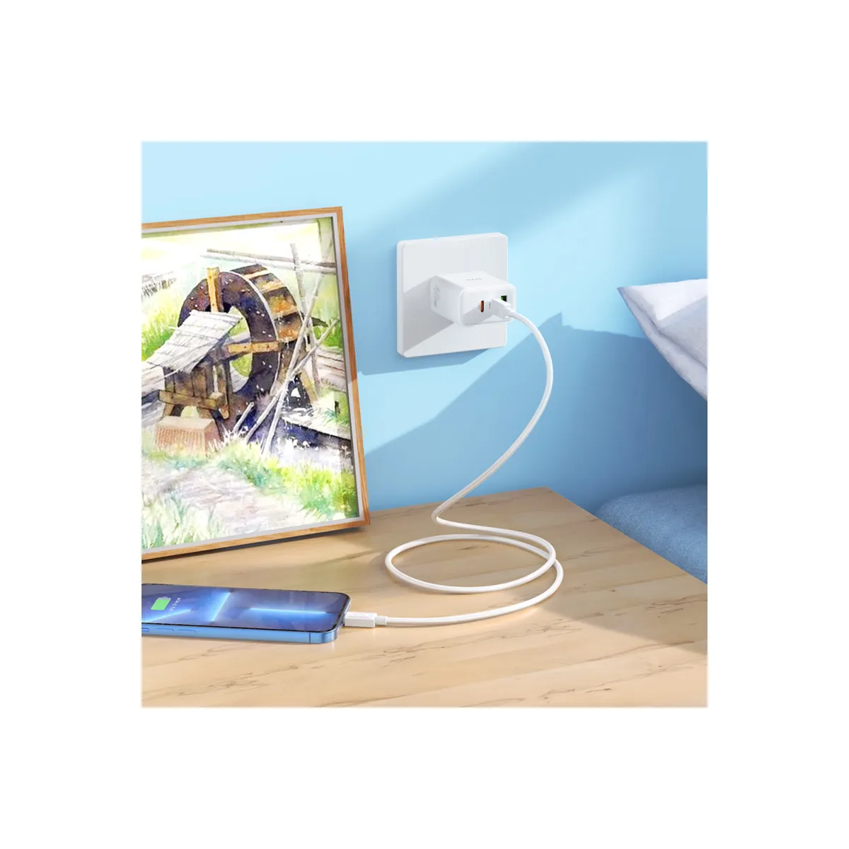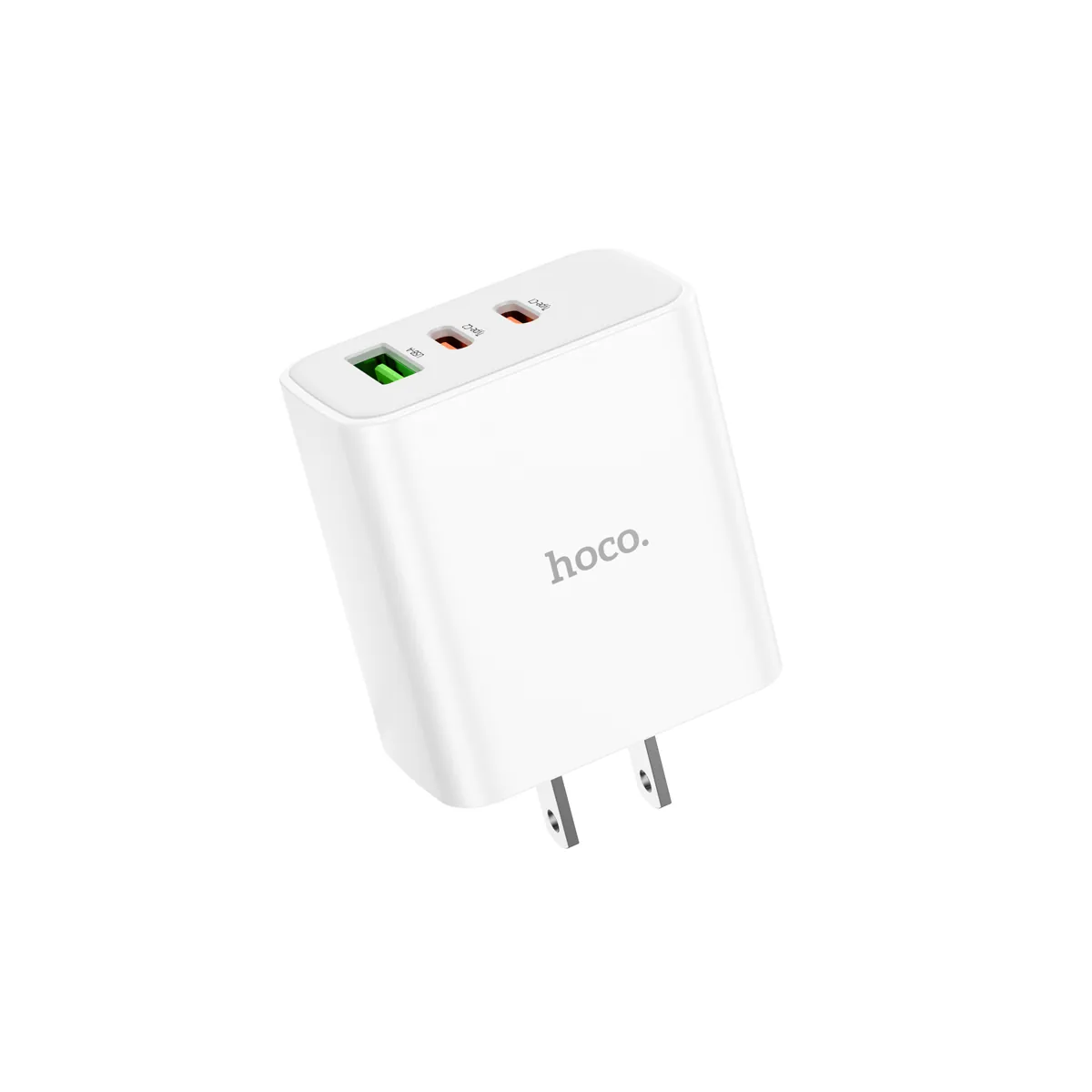 40W three-port wall charger with two 20W USB-C ports and one 18W USB-A. Charge your phone, tablet, and earbuds all at once — US plug, compact body.