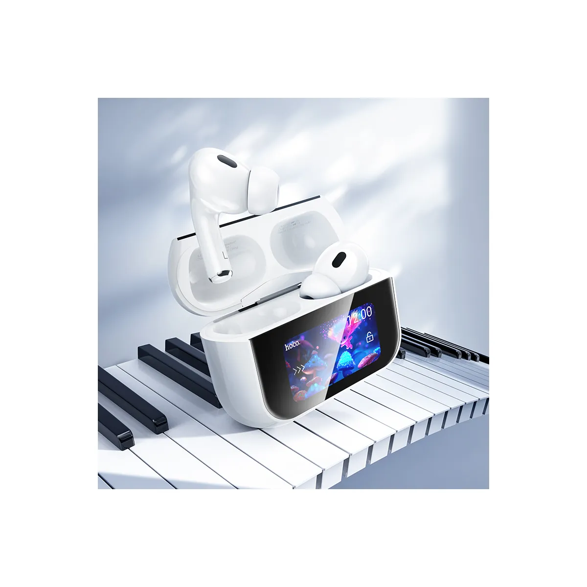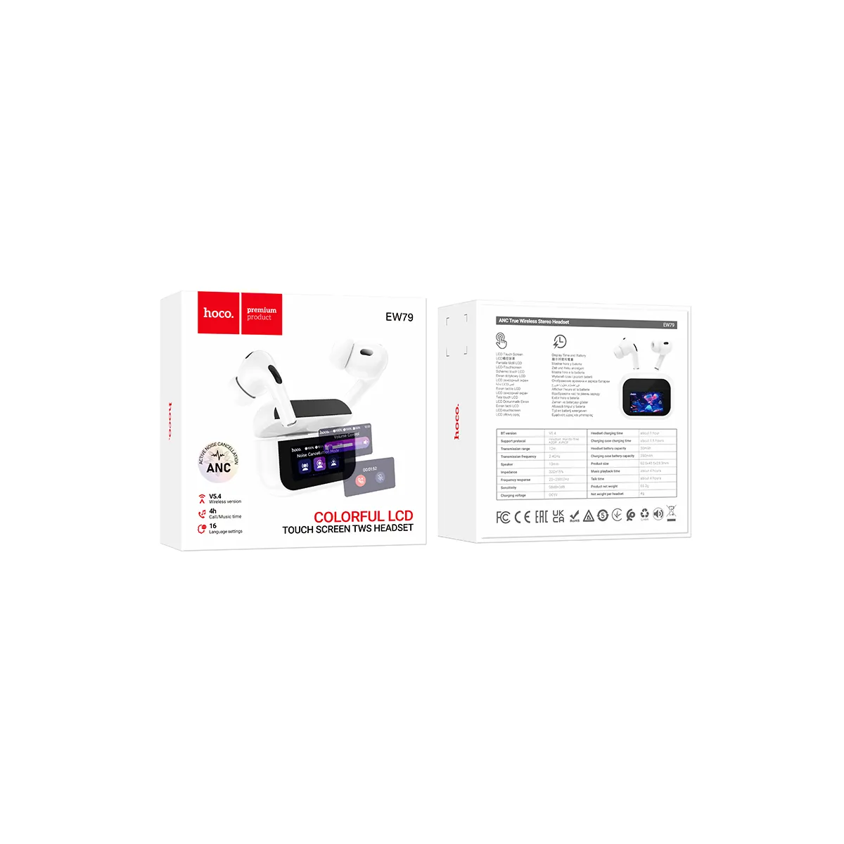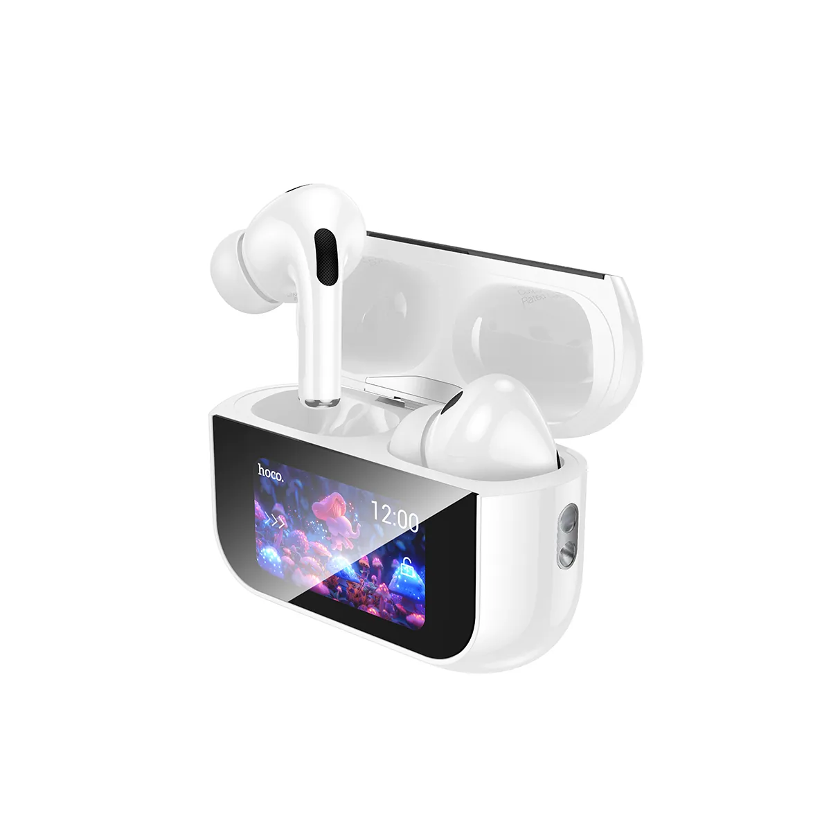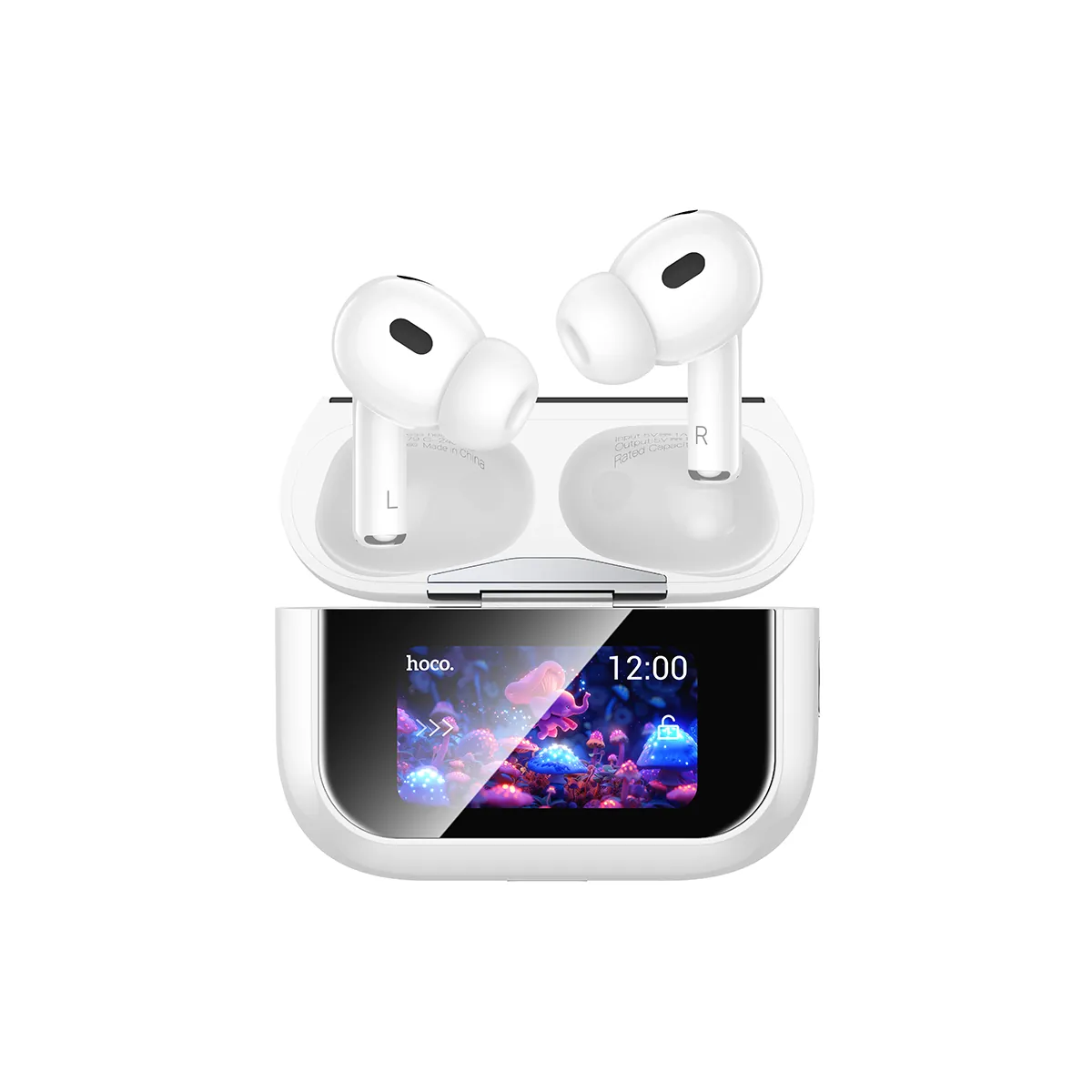 Charging case features an LED touchscreen showing battery level and the exact time.