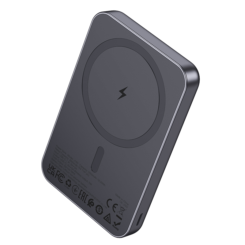 - 5W wireless output charges compatible phones while metal gray design looks premium in any pocket